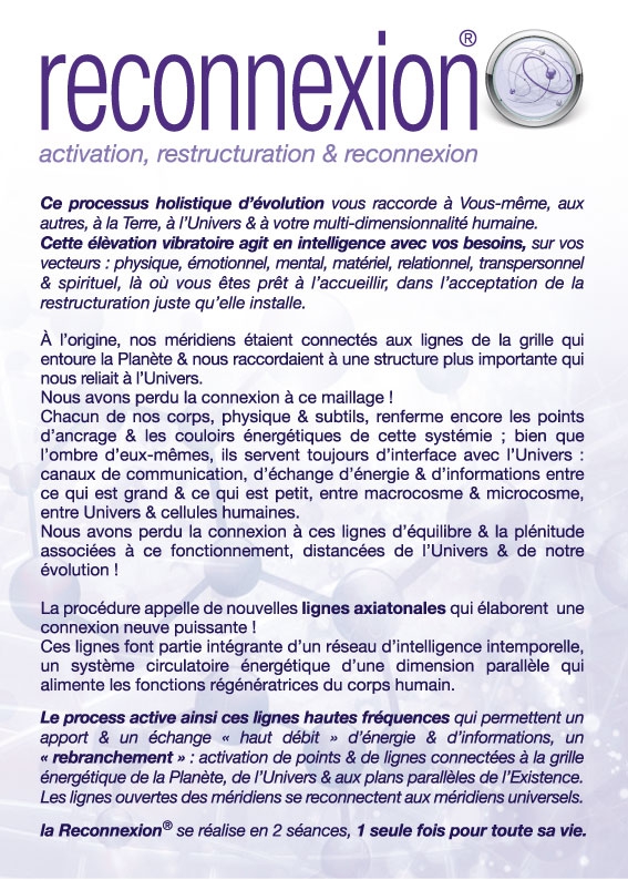 La Reconnexion® vous raccorde d’abord à vous-même, puis aux autres, à la Terre, à l’Univers et à votre multi dimensionnalité d’être humain.